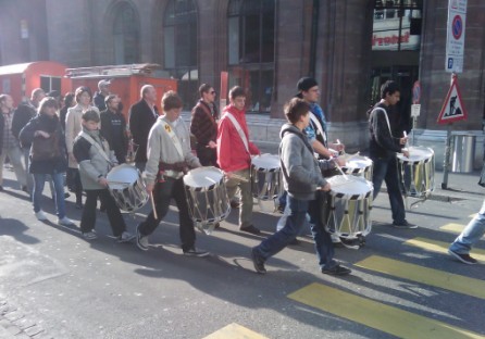 ウェイトレスさんがタイチャーハンを持ってきます。これがアルプスの山の中なら違和感もありますが、バーゼルの街中だからまあいいかなと思って食べると、これがうまい!カノジョに感謝。呼び止めてとても美味しかった旨伝えると、街を案内してくれるといいます。すばらしい。なんと、スイスでタイ人のシャキシャキなガールフレンドが出来てしまいました。仏教徒のカノジョに古い教会を案内してもらうという「違和感」の中お店に帰ってくると、いつの間にか屋台も出て鼓笛隊が通りをマーチしています。子供から老人まで一緒に演奏して歩く姿は、やはり異国情緒があって楽しい。意外な出会いに感謝したのでした。