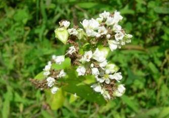 先日、研究所の前にある緑地で、白い花が風に揺られて咲いていました。私自身は初めて見る花だったのですが、ひとに聞いたところによるとソバの花だそうです。そういわれてみると、まだ青いながらも、どこかで見たことがある形の実がなっていました。